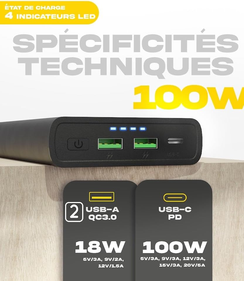 Notre batterie est équipée de la technologie USB-C Power Delivery 100W, vous permettant de recharger efficacement vos ordinateurs portables, smartphones et tablettes. Profitez d’une puissance de charge optimale, idéale pour les modèles les plus exigeants.