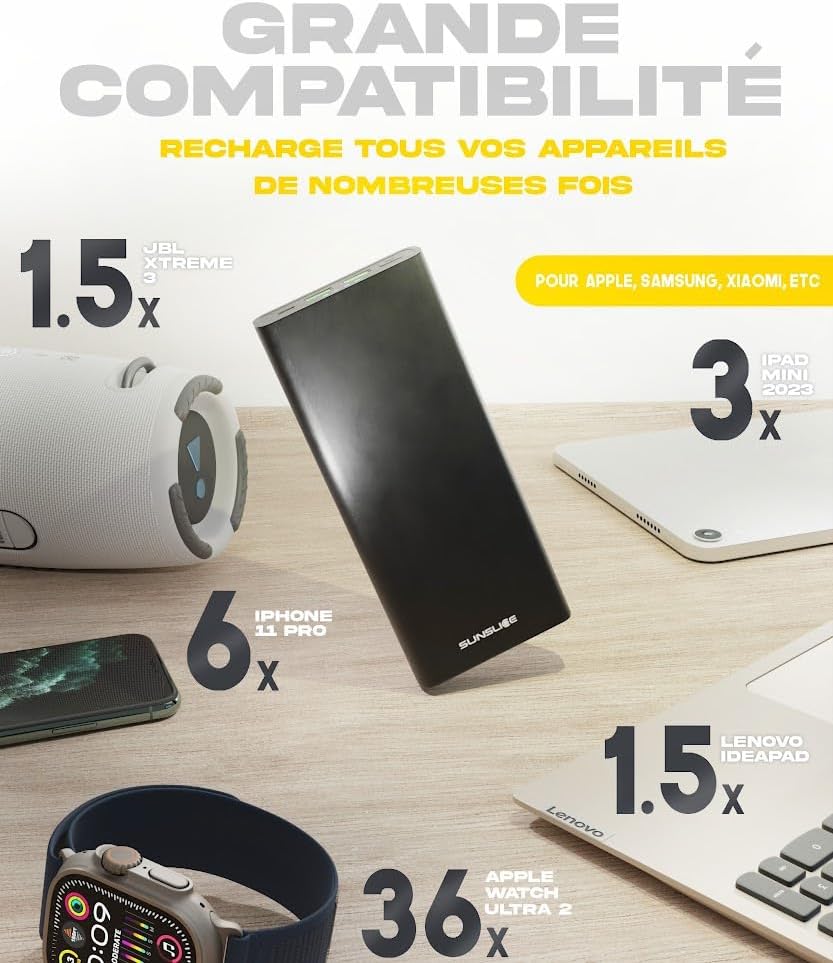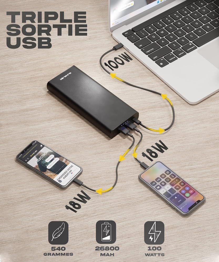 Avec une capacité exceptionnelle de 26 800 mAh, vous pouvez recharger plusieurs fois vos appareils sans avoir à rebrancher la batterie. Cette autonomie étendue est parfaite pour les longs trajets, les déplacements professionnels ou une journée bien remplie.