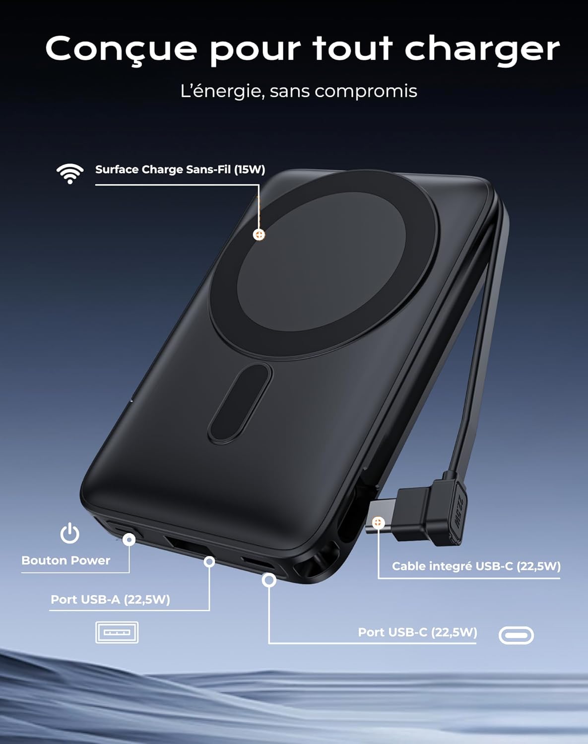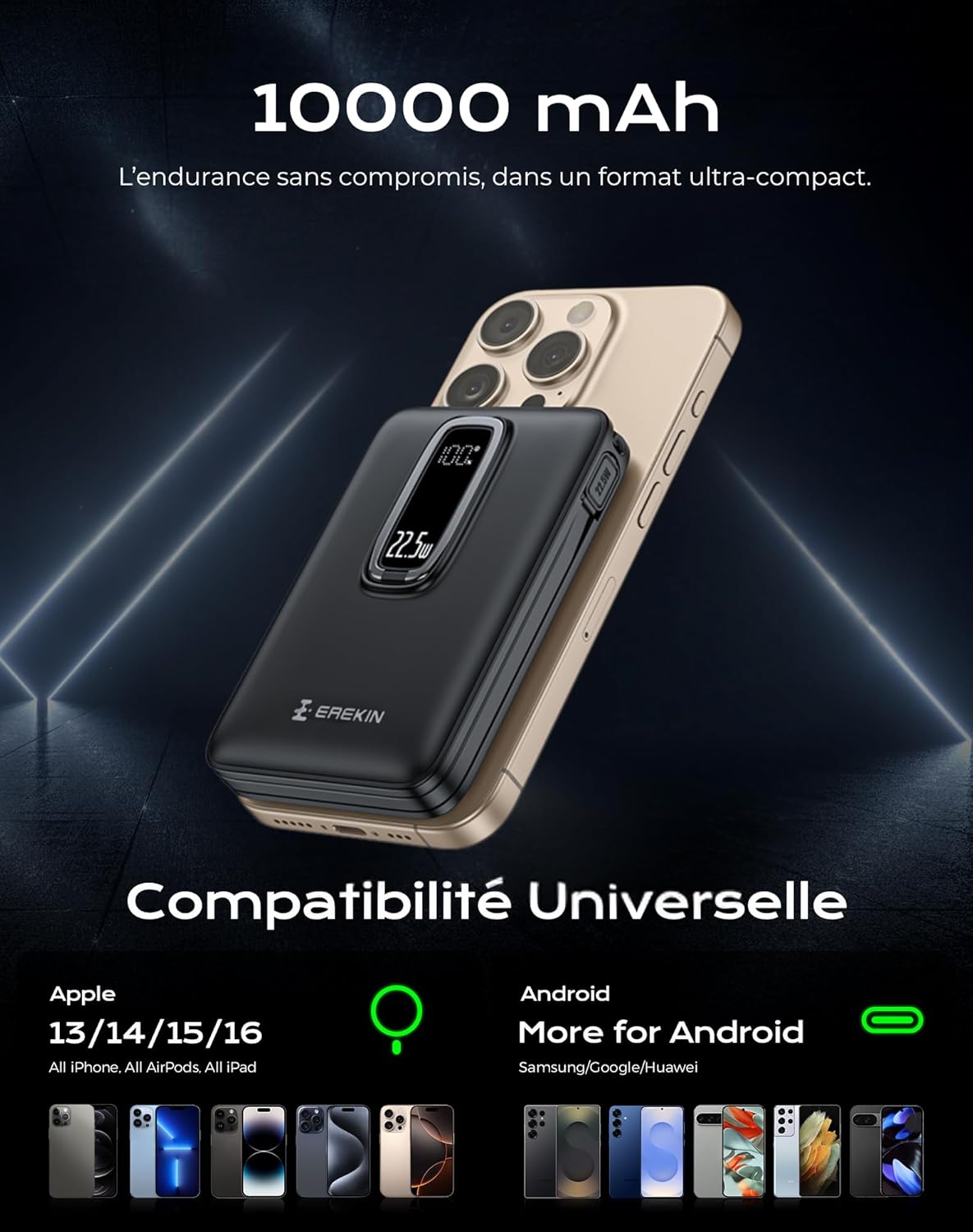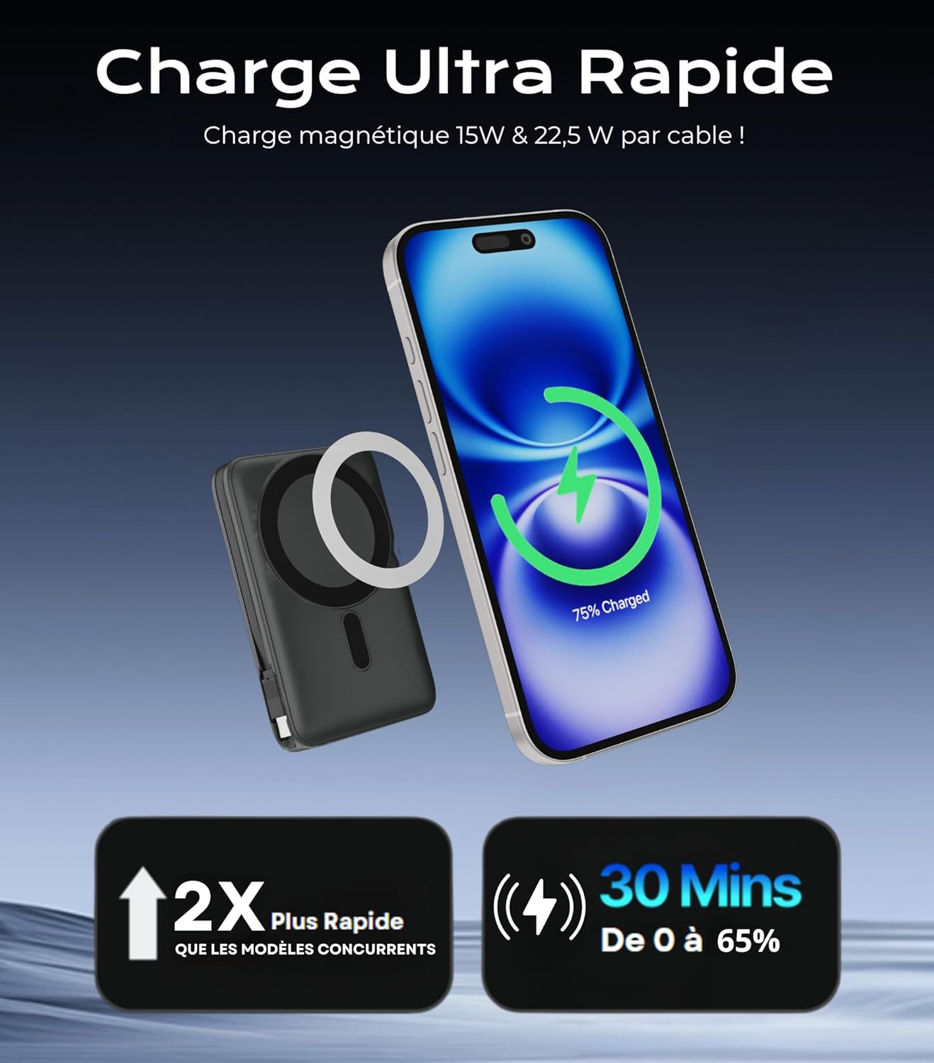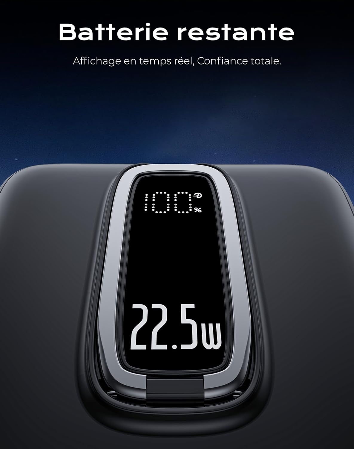 Notre accumulateur d’énergie portable vous offre une charge ultra-rapide, avec une puissance filaire de 22,5W et une charge sans fil Qi de 15W. La recharge filaire est compatible avec la charge rapide Android et iPhone via USB-C, tandis que la charge sans fil est idéale pour poser simplement votre téléphone sans brancher de câble, prenant en charge les iPhone MagSafe, les AirPods et les Samsung Galaxy. Cette double option de charge assure une compatibilité maximale et une efficacité remarquable.