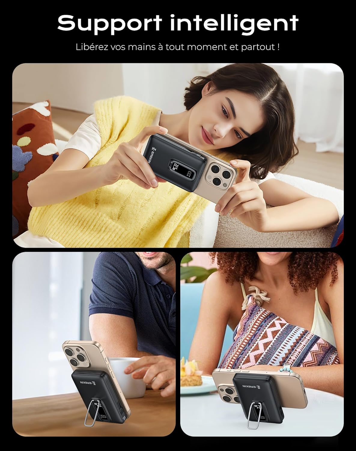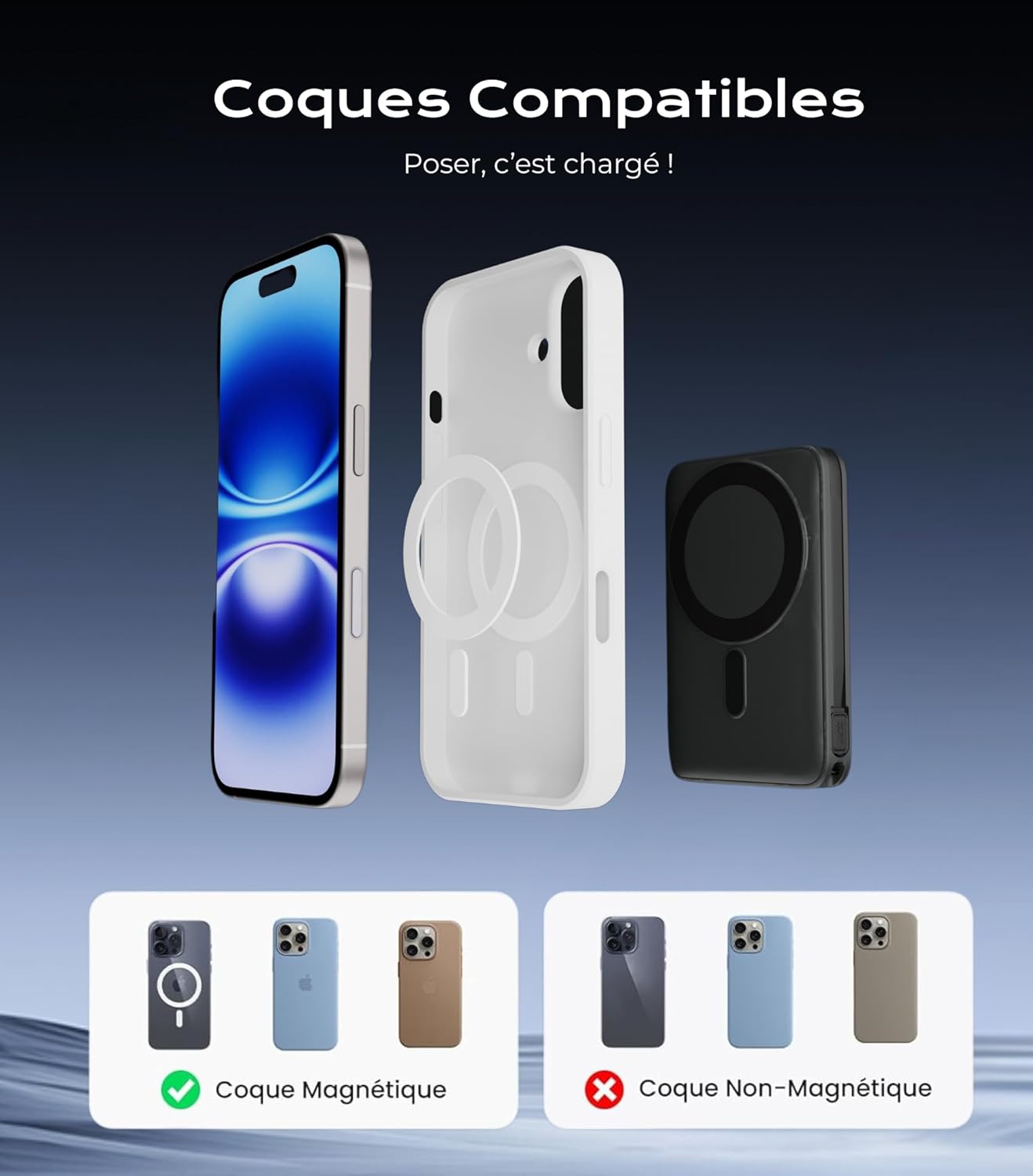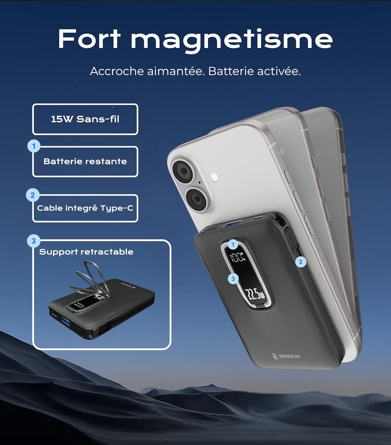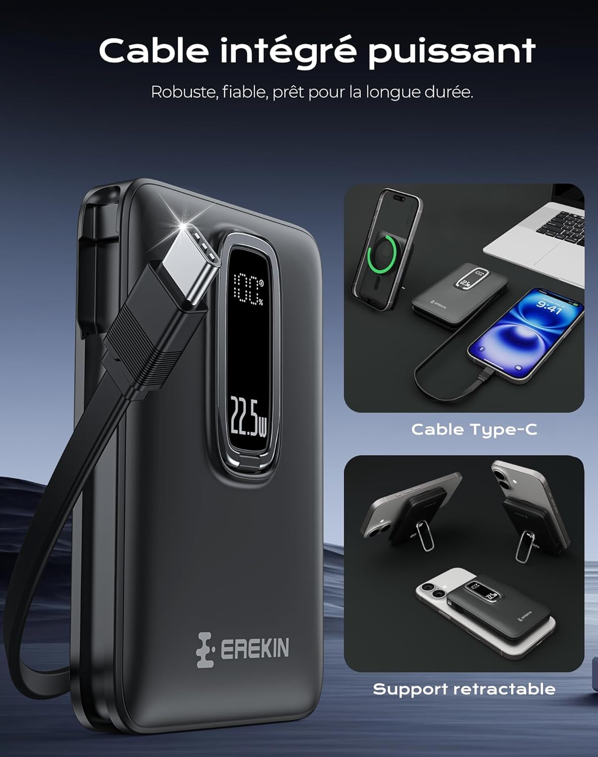 Notre accumulateur d’énergie portable vous offre une charge ultra-rapide, avec une puissance filaire de 22,5W et une charge sans fil Qi de 15W. La recharge filaire est compatible avec la charge rapide Android et iPhone via USB-C, tandis que la charge sans fil est idéale pour poser simplement votre téléphone sans brancher de câble, prenant en charge les iPhone MagSafe, les AirPods et les Samsung Galaxy. Cette double option de charge assure une compatibilité maximale et une efficacité remarquable.