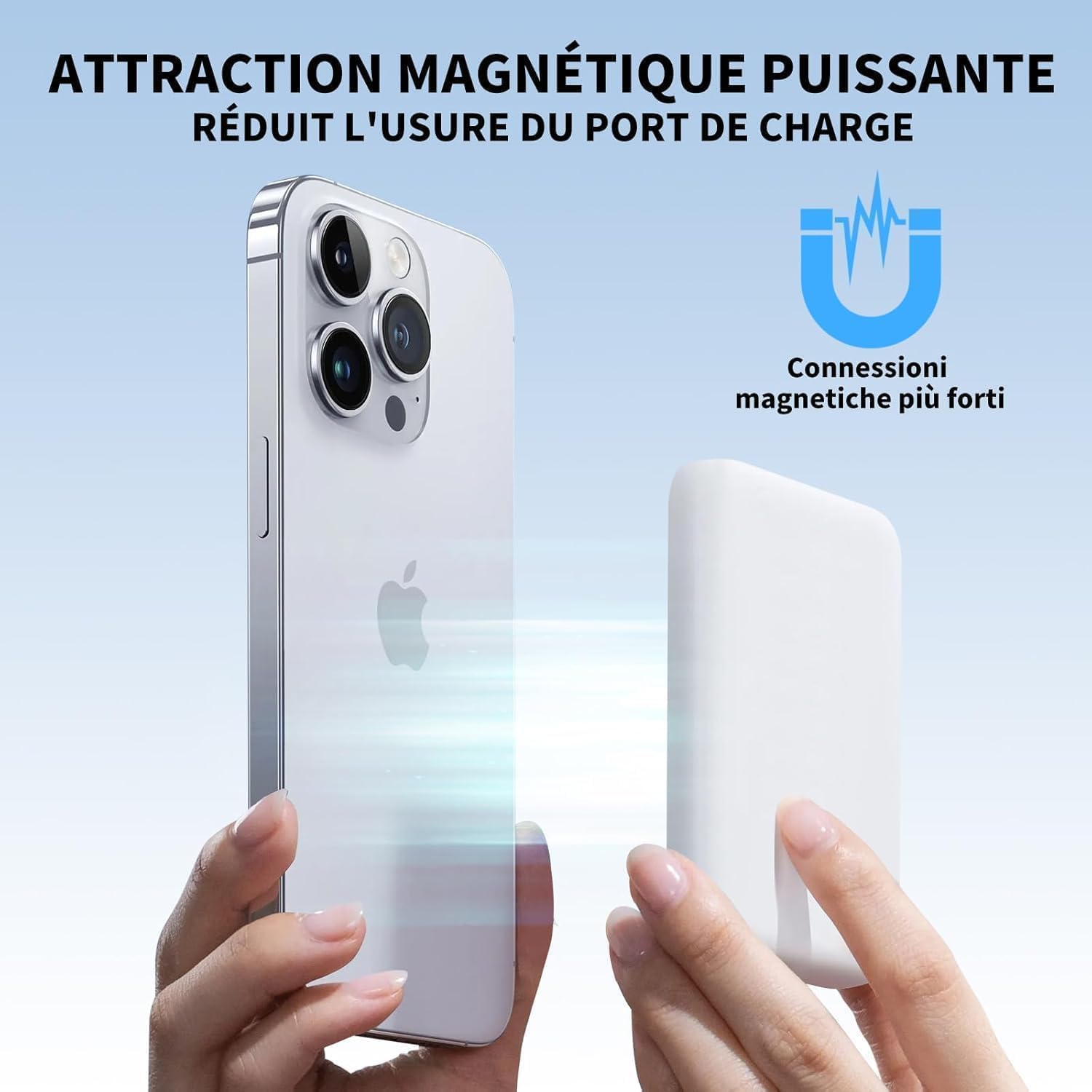 Notre accumulateur d’énergie magnétique offre une solution de charge sans fil spécialement conçue pour les modèles d’iPhone 16, 15, 14, 13 et 12 (incluant les versions Pro Max, Pro, standard, Plus et Mini). Grâce à la toute dernière technologie magnétique, cet accessoire se fixe solidement à l’arrière de votre appareil, assurant une connexion stable et une charge efficace. Il est important de noter que son fonctionnement optimal est garanti avec les coques certifiées MagSafe ou sans étui.