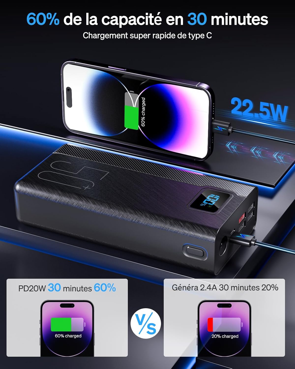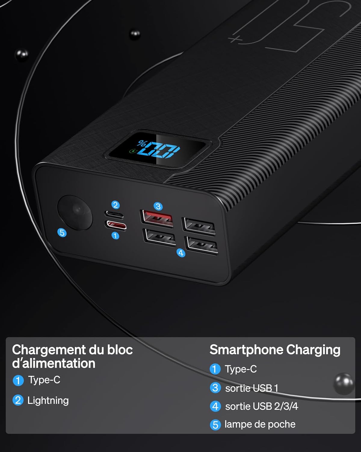 Grâce à sa capacité de 50 000 mAh, notre dispositif assure une autonomie prolongée, une réserve énergétique élevée, une alimentation continue, une stabilité de fonctionnement et une endurance longue durée. Ces performances correspondent aux attentes associées à un Chargeur Portatif 40000mAh, tout en reposant sur une base énergétique réelle plus élevée. L’architecture interne est conçue pour exploiter l’énergie de manière homogène sur toute la durée d’utilisation.